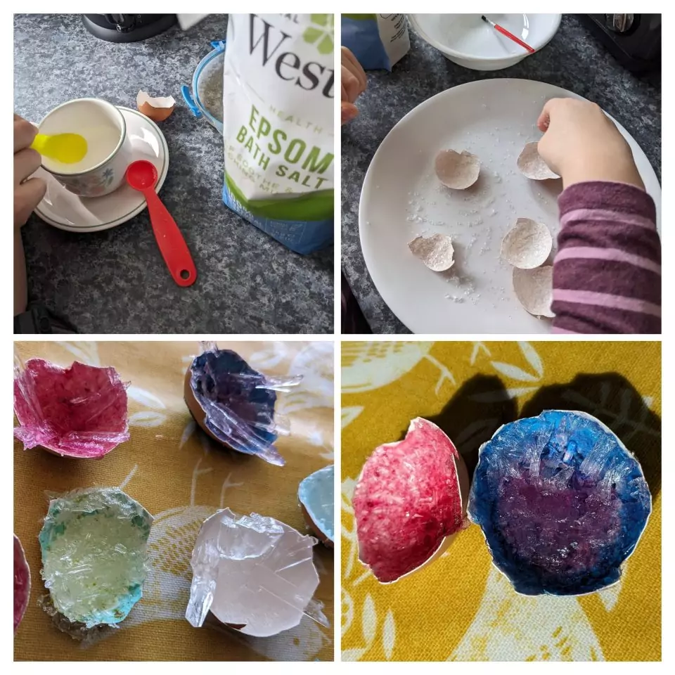 With some empty half eggshells, we grew crystals from Epsom salts and food colouring dissolved in water, to make our own geodes.