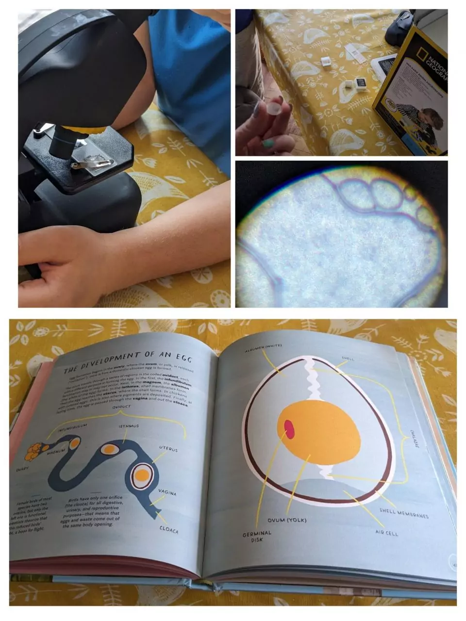 We used the beautiful book ‘Nests, Eggs, Birds – An Illustrated Aviary‘ by Kelsey Oseid, to learn what the egg is made of, and looked at a small piece of membrane through our microscope.