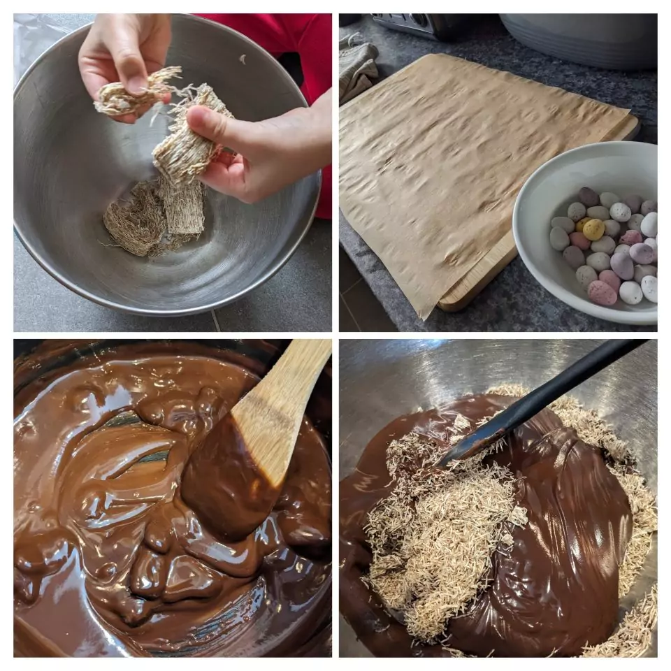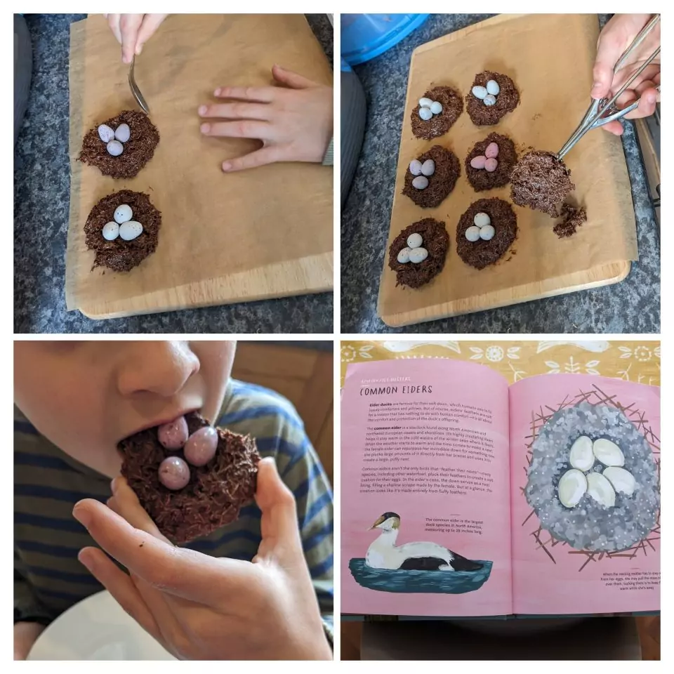 Of course we did some of the usual Easter baking too, making chocolate nests. However, we added a little educational twist to it. The children looked up bird eggs to see if they could identify what type of eggs they had in their nest. It wasn’t easy to get perfect matches with mini eggs, but it was quite fun trying. It was amazing to see the variety of colours and markings there are.